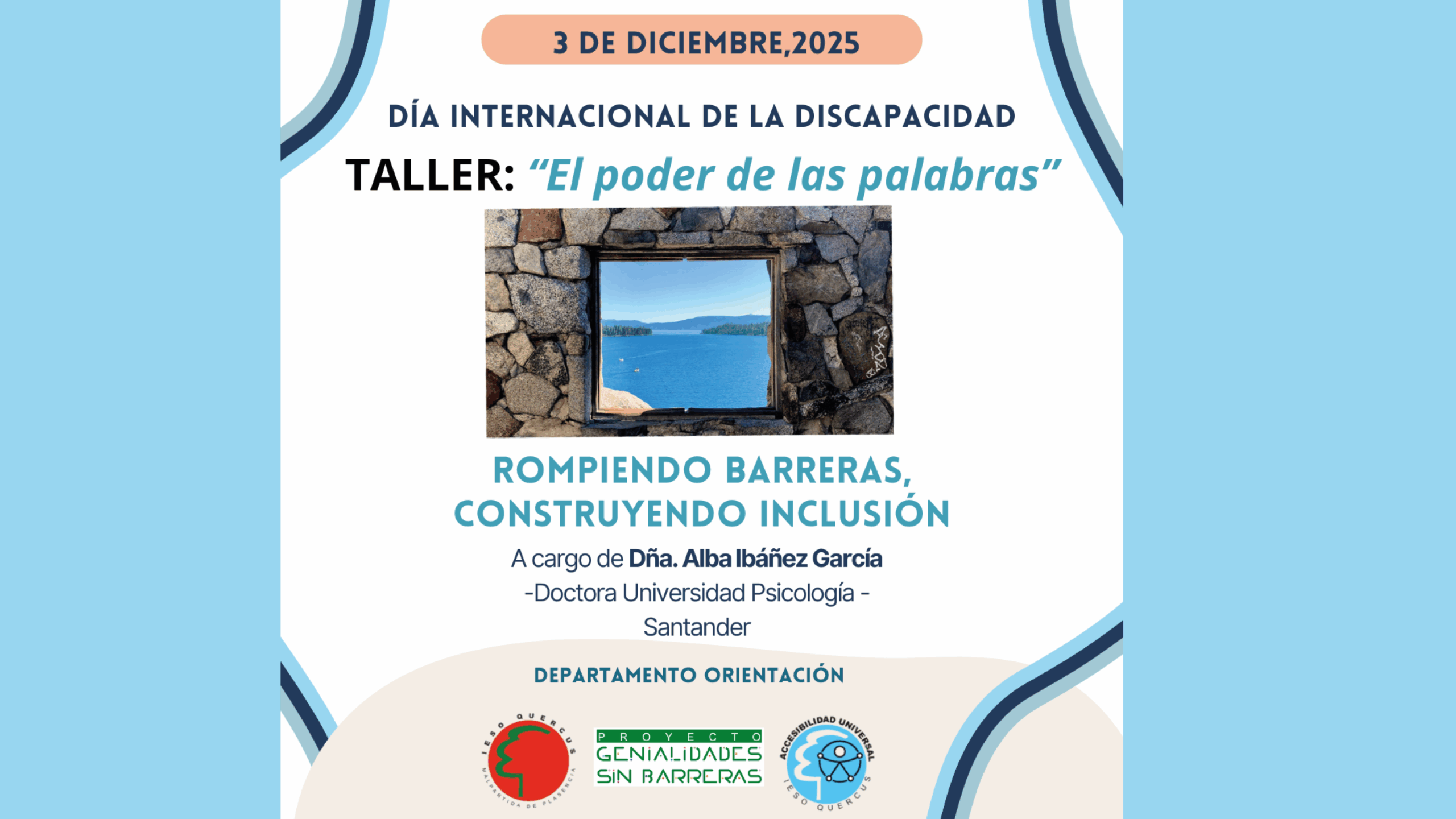 La actividad se denomina «EL PODER DE LAS PALABRAS«; será un TALLER impartido por Aba Ibañez García, doctora de la Universidad de Santander, y especialista en temas de discapacidad. La ponente, de manera online, dirigirá la sesión y estará apoyada por los tutores de los grupos de 1º ESO, y algunos miembros del departamento.